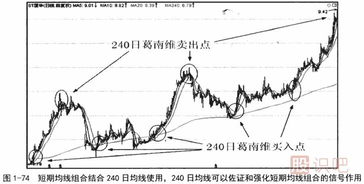 如圖1一73所示,ST廈華(600870)。股價經(jīng)常暴漲暴跌,5日、10日和20日短期均線組合也會跟隨股價起起落落。在股價下跌時,短期均線組合就會收出死亡交叉、空頭排列等見頂和看跌的技術形態(tài),表明股價處在空方控制之下。但無論股價如何起伏波動,240日均線都一直支撐著股價上行,表明長期上升趨勢沒有改變。