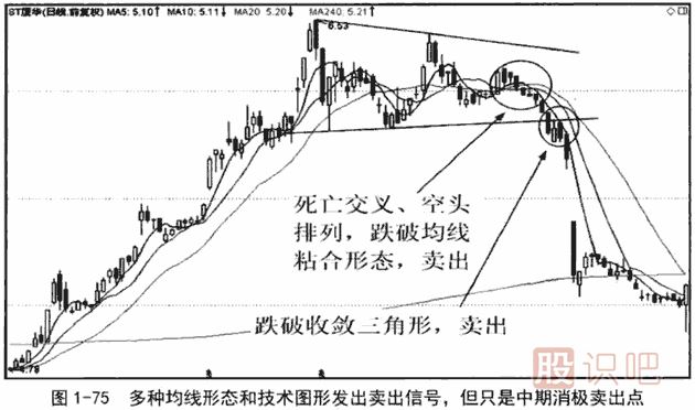 圖1一75是圖1一74中第一個賣出點前后的日線圖,圖中股價在頂部走出一個收斂三角形。三角形內(nèi)出現(xiàn)均線死亡交叉,打破均線粘合形態(tài).并隨之走出均線空頭排列,都是見頂或看跌的信號。多種賣出信號疊加,會讓熟稔技術分析的交易者心內(nèi)不安,至少會沽出一部分籌碼。