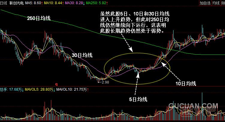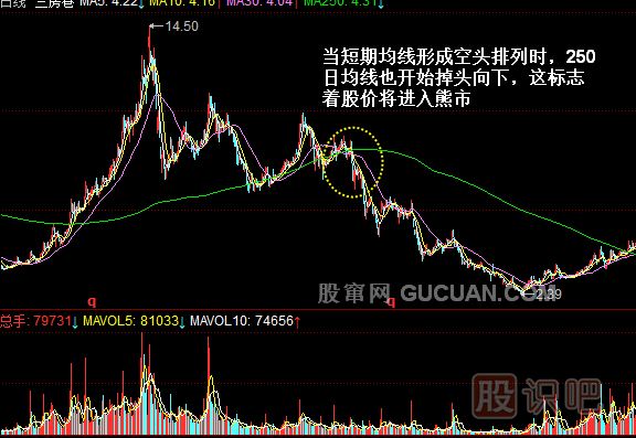 由于250日均線并不是用來分析這一年的走勢的,而是用來分析幾年來市場總體趨勢的,因此對指數(shù)漲跌的反應(yīng)非常緩慢,輕易不會出現(xiàn)拐頭。此均線一旦出現(xiàn)拐頭,對大盤的中長期走勢會產(chǎn)生深遠(yuǎn)影響,不過250日均線對于市場中短期走勢影響較小。250日均線形成一定的角度向上或向下運(yùn)行時(shí),指數(shù)隨后會出現(xiàn)長期牛市或長期熊市,但年線向下運(yùn)行或處于走平狀態(tài)時(shí),短期內(nèi)股指或股價(jià)還會沿原趨勢波動,也就是說股指或股價(jià)既可能上漲,也可能下跌或是繼續(xù)橫向整理。
