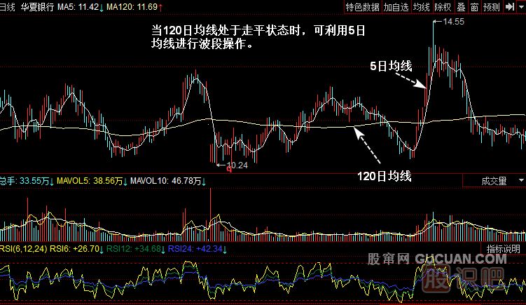(5)120日均線走平,股指或股價圍繞120日均線運行時,可依據(jù)5日均線的波動進行波段操作。