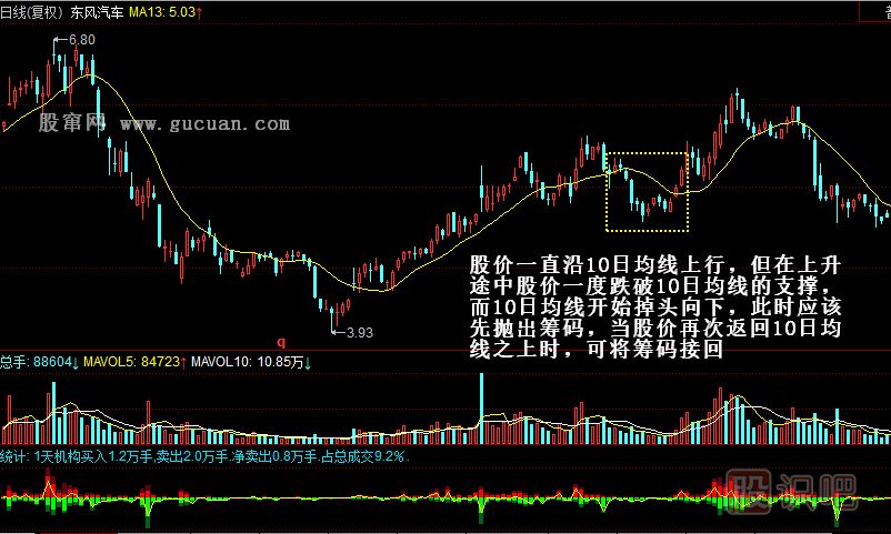 只要上升行情未結(jié)束,股價(jià)跌破10日均線(xiàn)的時(shí)間往往很短且成交量明顯縮小,一般最多是3-5個(gè)交易日,股價(jià)就會(huì)重回10日均線(xiàn)之上。如果股價(jià)放量跌破10日線(xiàn)時(shí)很長(zhǎng)時(shí)間才回到10日均線(xiàn)之上,表明此股主力控盤(pán)的能力很弱,后期股價(jià)上升的力度就很有限或是出現(xiàn)了其他的調(diào)整形態(tài)。