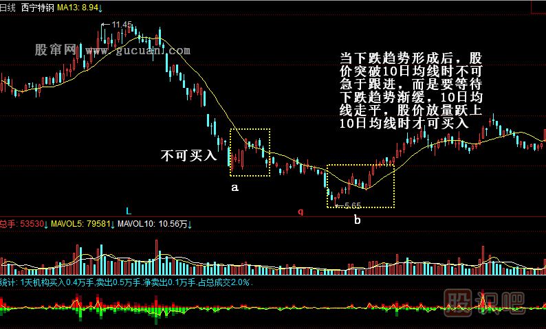 所以說(shuō)10日均線(xiàn)成為我們判斷大盤(pán)或個(gè)股短線(xiàn)趨勢(shì)的一個(gè)重要的參考指標(biāo),也就是說(shuō)當(dāng)股價(jià)在10日均線(xiàn)之上運(yùn)行,并且10日均線(xiàn)向上移動(dòng)時(shí),就可確定股價(jià)在短期內(nèi)的趨勢(shì)是向上的,股價(jià)還會(huì)繼續(xù)上漲;而當(dāng)股價(jià)在10日均線(xiàn)之下運(yùn)行,并且10日均線(xiàn)向下移動(dòng)時(shí),就可確定股價(jià)在短期內(nèi)趨勢(shì)是向下的,股價(jià)還是繼續(xù)下跌。在操作中,我們可以把10日均線(xiàn)作為買(mǎi)入的依據(jù),股價(jià)站上10日均線(xiàn)再買(mǎi)入,雖然此時(shí)離底部或與最低價(jià)相差一定價(jià)位,買(mǎi)入的價(jià)格相對(duì)會(huì)高一些,當(dāng)這時(shí)上升趨勢(shì)已經(jīng)確立,漲勢(shì)剛剛開(kāi)始,此時(shí)買(mǎi)入是比較穩(wěn)妥的。
