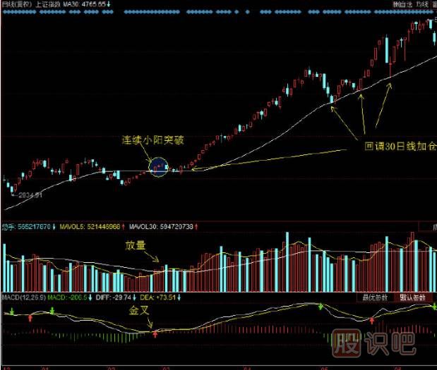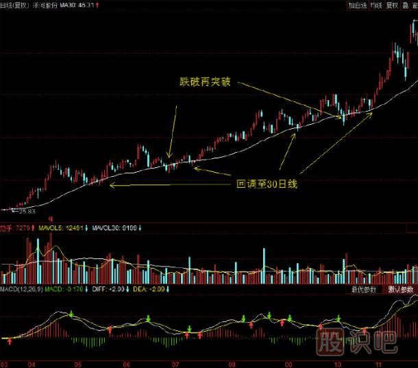 3)30日線是臨界點,突破后30日線成強支撐線,跌破后30日線強壓制線;