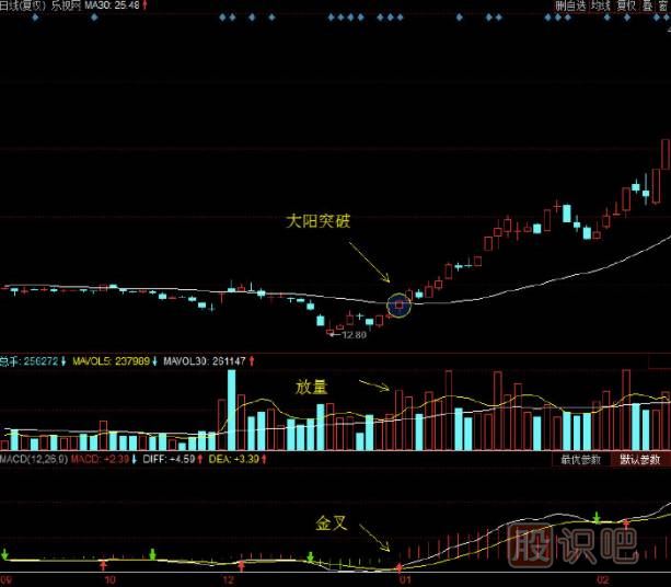 一般股價突破30日均線走平或走多,能否最終形成真正的突破,還需要看突破的時候,MACD能否在0軸附近同步金叉,或者同步騰空而起。