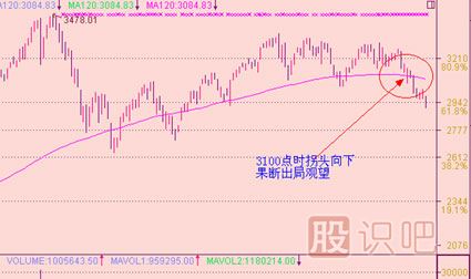 這個(gè)圖是最近A股上證走勢(shì)圖,3100點(diǎn)時(shí)拐頭開始向下,此時(shí)投資者必須果斷出局,這是基于趨勢(shì)線的指導(dǎo)作用所做的決定。從此處看大盤后市還有下挫空間,投資者不可盲目抄底。那什么時(shí)候可以去跟進(jìn)抄底,我們下面將要詳細(xì)講述。