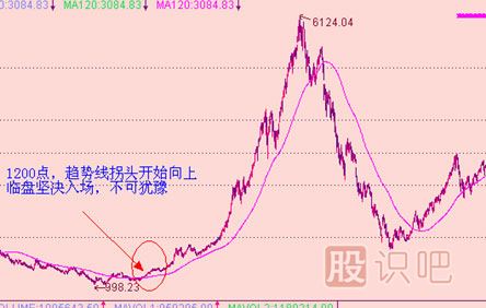趨勢(shì)線就是通常所說(shuō)的120日均線,俗稱半年線,有的人也稱之為牛熊線。這里我們所說(shuō)的趨勢(shì)線可用于分時(shí)、日線、周線、月線,但如果不特別強(qiáng)調(diào)就僅指日線。趨勢(shì)線是股市中長(zhǎng)期走勢(shì)的風(fēng)向標(biāo),是絕大多數(shù)主力、莊家進(jìn)退的依據(jù),在實(shí)盤操作中對(duì)我們有巨大的指導(dǎo)意義。