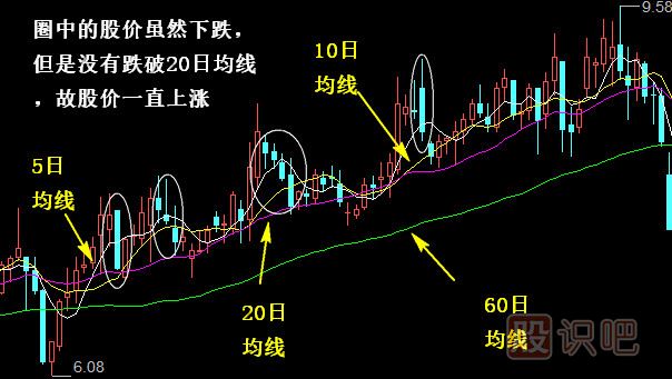 2.20日均線的趨勢研判仍為上升代表中短期趨勢向上,下行則表示趨勢向下,所以在使用20日均線來分析走勢時(shí),還可以用其來判斷市場的支撐或壓力的位置,但同時(shí)一定要關(guān)注20日均線作為支撐或壓力的有效性,否則將導(dǎo)致錯(cuò)誤性止損。