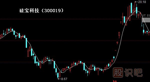 如圖硅寶科技(300019)的一段日K線走勢(shì)圖,圖中只保留了一條均線——5日均線。利用5日均線,可以看到該股處于向上波動(dòng)運(yùn)行的行情之中。