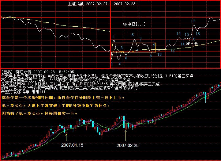昨天下午的是1分鐘級(jí)別的上漲,昨天收盤(pán)前是一個(gè)1分鐘以下級(jí)別的頂背馳,今天早上1006附近是一個(gè)1分鐘以下級(jí)別的底背馳,然后出現(xiàn)一個(gè)大的中樞,上下震蕩,收盤(pán)勉強(qiáng)拉回這個(gè)中樞。明天,如果大盤(pán)在這中樞下出現(xiàn)第三類賣點(diǎn),那大盤(pán)就會(huì)繼續(xù)探下去。否則依然圍繞這中樞震蕩。
