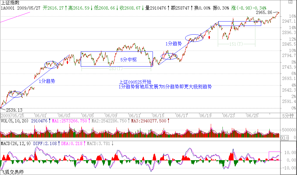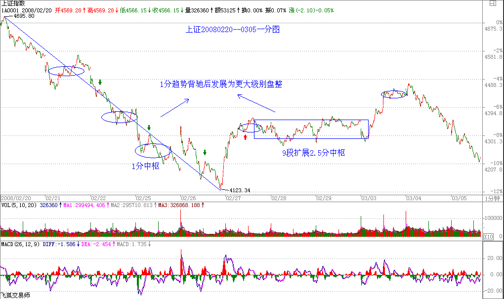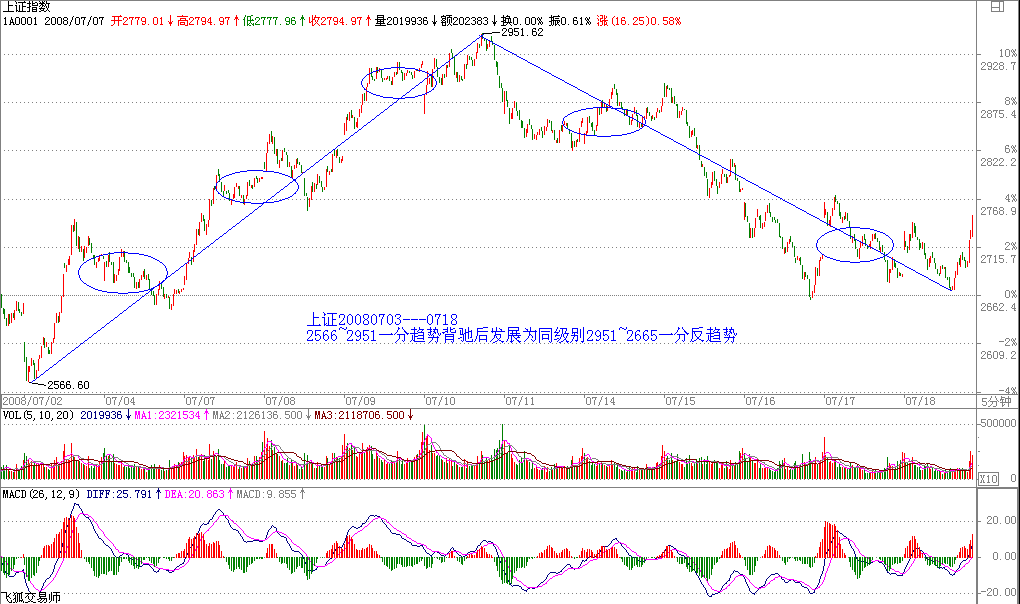 該定理的證明有點(diǎn)抽象,估計(jì)大多數(shù)的人都沒興趣,那就用一個(gè)例子來說明,也大致知道證明的輪廓,更重要的是,這樣,各位對走勢的形成有一個(gè)更深切的認(rèn)識。例如,一個(gè)5分鐘背馳段的下跌,最終通過1分鐘以及1分鐘以下級別的精確定位,最終可以找到背馳的精確點(diǎn),其后就發(fā)生反彈。注意,反彈只是一般的術(shù)語,在本ID的理論中,對這反彈會(huì)有一個(gè)很明確的界定,就是包括三種情況:一、該趨勢最后一個(gè)中樞的級別擴(kuò)展、二、該級別更大級別的盤整、三該級別以上級別的反趨勢。