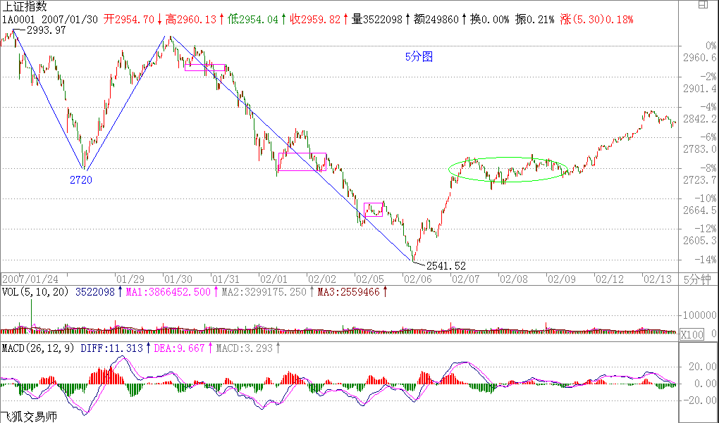 例如,這次20070206的反彈,用5分鐘背馳段,然后考察1分鐘以及1分鐘以下級別的背馳進(jìn)行精確定位,可以極為精確地把握這個(gè)底部,而且在實(shí)踐中,很多人按照本ID的理論都把握住了,那么,其后的反彈,第一波是1分鐘走勢馬上回到從2980開始的5分鐘下跌的最后一個(gè)中樞里,這樣就意味著第一種最弱的情況可能性可以完全排除了,其后,1分鐘的走勢繼續(xù)完成,擴(kuò)展成一個(gè)5分鐘的上漲,在20070207的11點(diǎn)前后,一個(gè)1分鐘的背馳制造了上漲的結(jié)束,其后進(jìn)入一個(gè)中樞的震蕩中,這個(gè)中樞,按照本章的定理,就可以斷言,至少是5分鐘級別的,而實(shí)際上演化成一個(gè)30分鐘級別的,這意味著,一個(gè)快速的5分鐘上漲的可能就沒有了,后面只有兩種演化的可能,就是一個(gè)30分鐘以上級別的盤整,或者是一個(gè)30分鐘以上的上漲,至于哪種情況,就必須看后面走勢的演化。