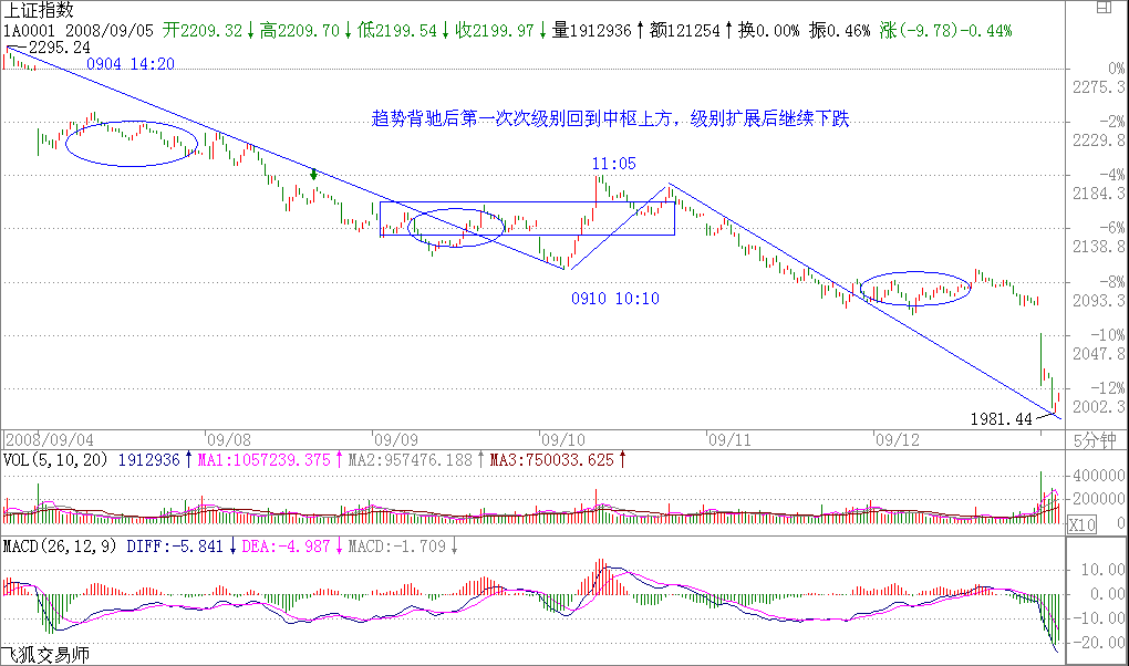 對于5分鐘級別趨勢發(fā)生背馳的情況,那這個(gè)5分鐘級別的趨勢里所具有的中樞都是5分鐘級別的,假設(shè)共有N個(gè),顯然,這個(gè)N>=2??紤]最后一個(gè)中樞的情況,最后的背馳段,跌破該中樞后,該背馳段顯然是一個(gè)1分鐘以下級別的走勢,否則就和該中樞是5分鐘級別趨勢的最后一個(gè)中樞的前提矛盾了。該背馳段出現(xiàn)第一類買點(diǎn)發(fā)生反彈,顯然,該反彈一定觸及最后一個(gè)中樞的DD=min(dn),也就是圍繞該中樞震蕩的最低點(diǎn),否則,如果反彈連這都觸及不了,就等于在下面又至少形成一個(gè)新的5分鐘中樞,這與上中樞是最后一個(gè)矛盾。這種只觸及最后一個(gè)中樞的DD=min(dn)的反彈,就是背弛后最弱的反彈,這種反彈,將把最后一個(gè)中樞變成一個(gè)級別上的擴(kuò)展,例如,把5分鐘的中樞擴(kuò)展成30分鐘甚至更大的中樞。