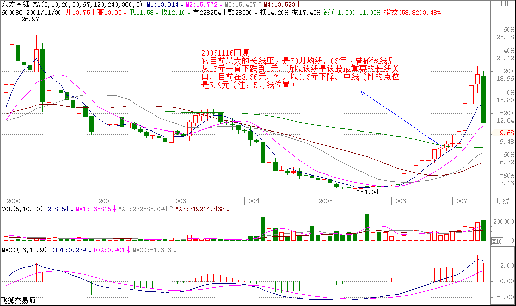 至于你說(shuō)的600086,它已經(jīng)長(zhǎng)了很多了,連續(xù)拉了8個(gè)月的陽(yáng)線(xiàn)從1塊多長(zhǎng)到7塊多,出現(xiàn)調(diào)整是最正常不過(guò)了纏中說(shuō)禪博客敘說(shuō)給賺了指數(shù)虧了錢(qián)的一些忠告。關(guān)鍵是你買(mǎi)的位置,如果你是最近才買(mǎi)的,對(duì)面臨的調(diào)整風(fēng)險(xiǎn)就要有所承受。本ID現(xiàn)在只能告訴你它現(xiàn)在的具體狀況。它目前最大的長(zhǎng)線(xiàn)壓力是70月均線(xiàn),03年時(shí)曾碰該線(xiàn)后從13元一直下跌到1元,所以該線(xiàn)是該股最重要的長(zhǎng)線(xiàn)關(guān)口,目前在8.36元,每月以0.3元下降。中線(xiàn)關(guān)鍵的點(diǎn)位是5.9元(注:5月線(xiàn)位置),該位置不能有效跌破,否則調(diào)整的幅度會(huì)很大。目前可以看成是5